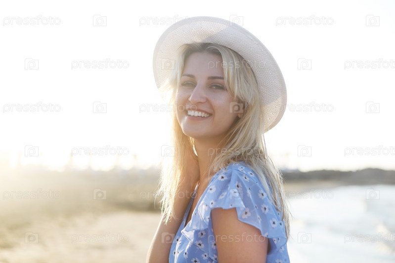 Молодая женщина в летнем платье с соломенной шляпой