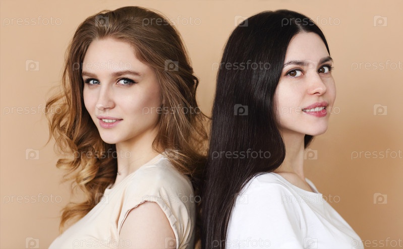 Две красивые мультикультурные молодые женщины на бежевом фоне