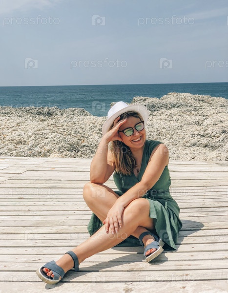 Счастливая блондинка, сидящая на деревянной террасе на берегу моря в солнечный летний день