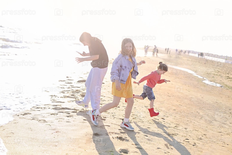 Радостная счастливая семейная мать и две дочери стоят на берегу моря