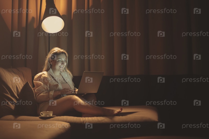 Позитивная блондинка в повседневной одежде пьет чай, сидя на уютном диване с ноутбуком
