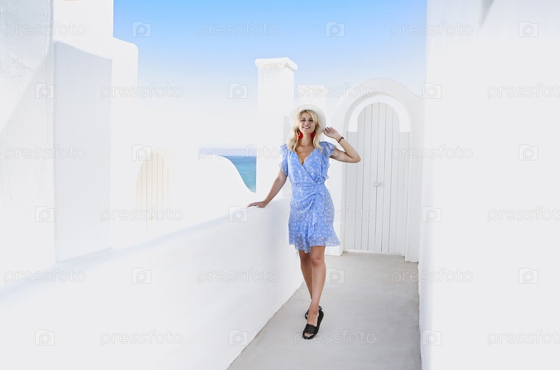 Молодая женщина в летнем платье с соломенной шляпой