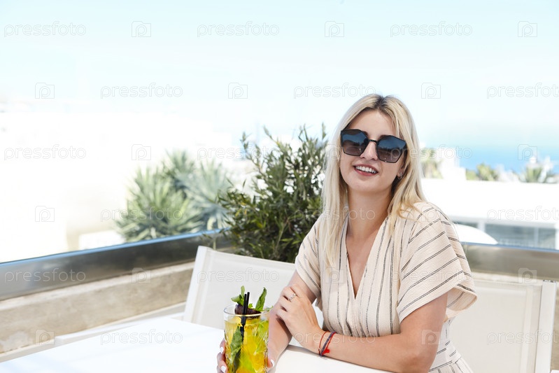Красивая женщина, держащая стакан коктейля из маракуйи