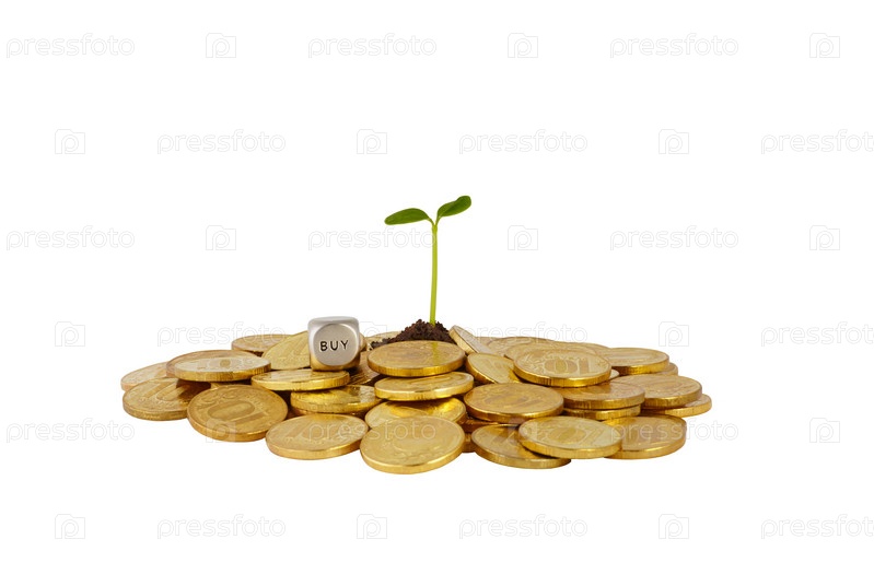 Горстка монет с небольшим ростком и костью со словом BUY