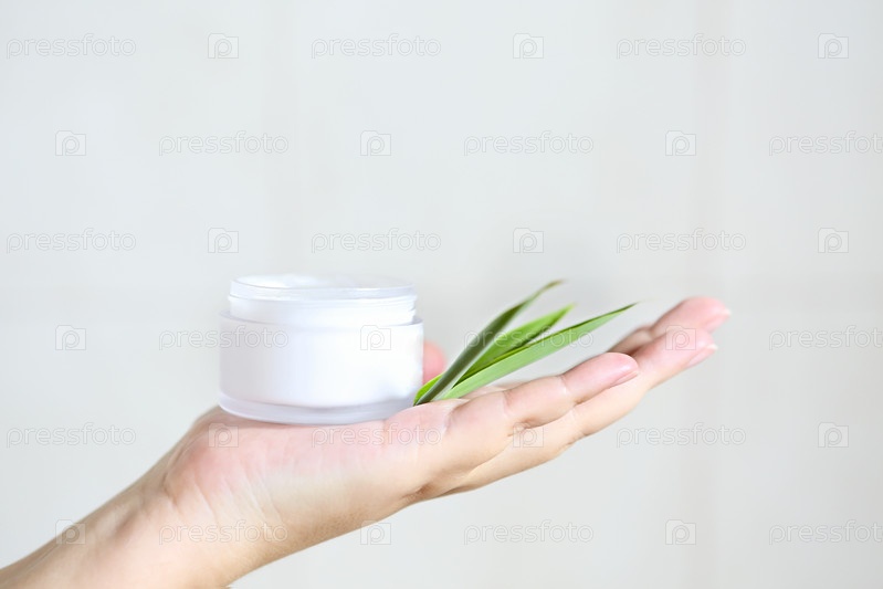 Женщина держит в руке крем с зелеными листьями бамбука