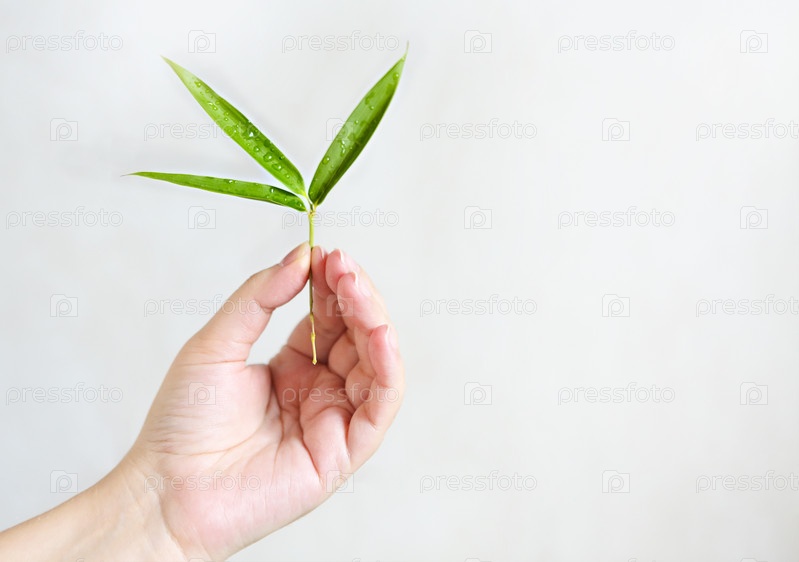 Женщина держит в руке зеленые листья бамбука