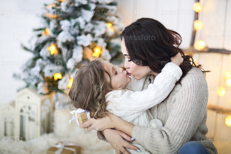 Красивая счастливая мать с младшей дочерью в вязаном свитере сидит на фоне рождественского интерьера