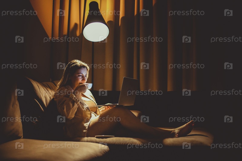 Позитивная женщина пьет чай, сидя на уютном диване с ноутбуком дома вечером