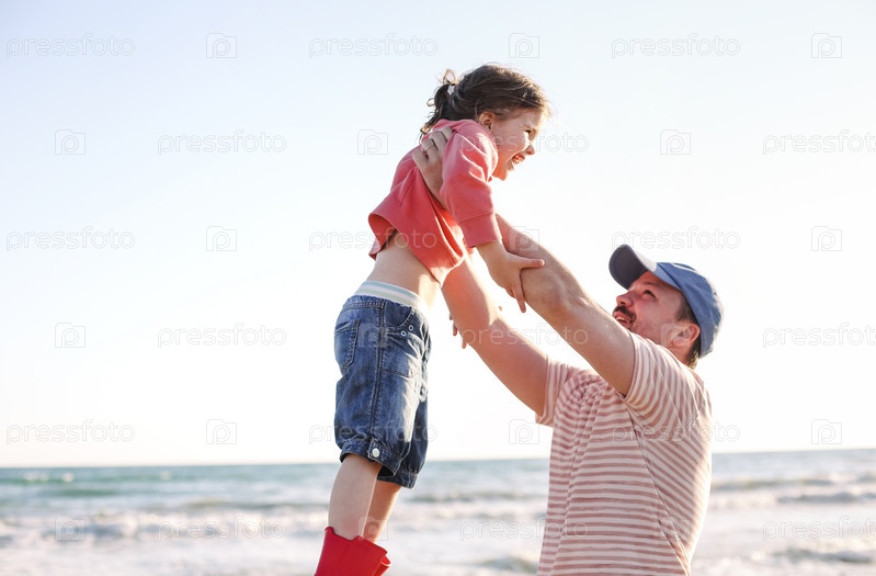 Отец играет со своей маленькой дочерью на морском пляже