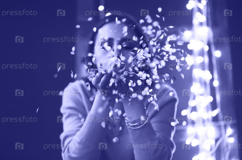 Счастливая красивая брюнетка в свитере, дующая на конфетти