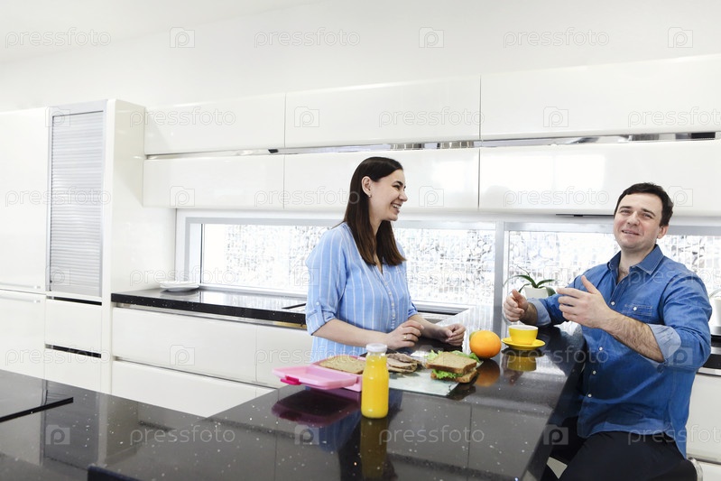 Счастливая веселая брюнетка пара семейных родителей вместе на кухне, готовит еду для романтического завтрака