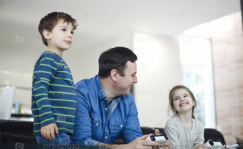 Улыбающийся молодой человек играет в видеоигры вместе с сыном и дочерью в современной гостиной