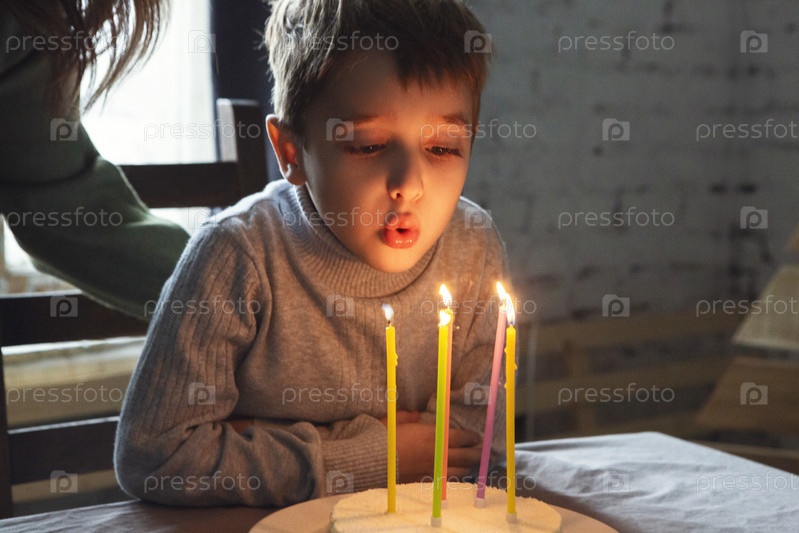 Маленький мальчик задувает свечи на домашнем именинном торте во время празднования дня рождения дома