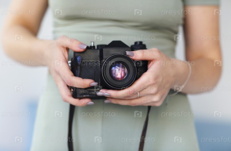 Фотограф молодой женщины принимая фотоснимок с камерой внутри помещения. Крупным планом