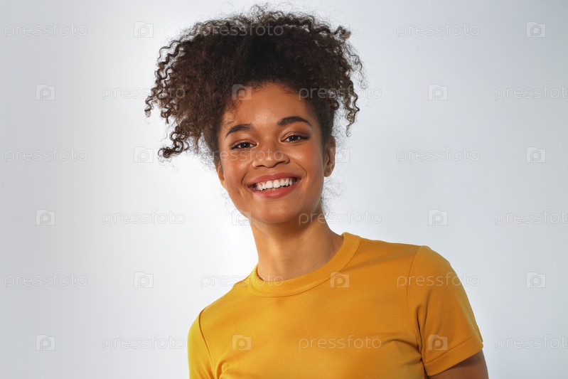 Обрадованная африканская американка в ярко-желтой футболке с вьющимися волосами смеется, глядя в камеру, показывая свои белые гладкие зубы, позируя на фоне серой стены студии