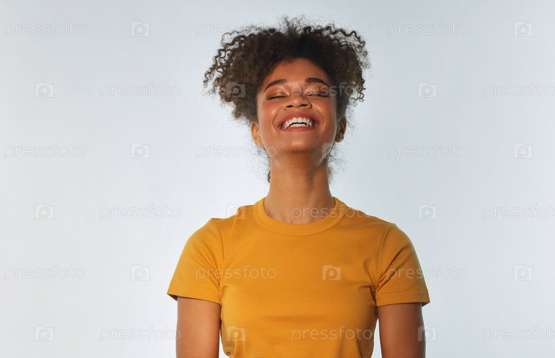 Обрадованная африканская американка в ярко-желтой футболке с вьющимися волосами смеется, глядя в камеру, показывая свои белые гладкие зубы, позируя на фоне серой стены студии