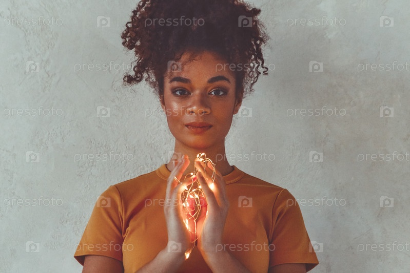 Счастливая африканская американка, стоящая с праздничными светодиодными огнями вокруг рук и тела, поднимающая одну руку и улыбающаяся в камеру, позирующая у бетонной стены