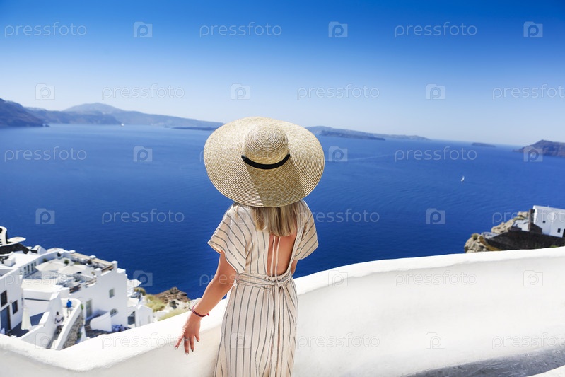 Молодая женщина в белом платье и соломенной шляпе гуляет по городу Ия, остров Санторини, Греция