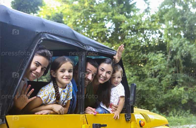 Счастливая улыбающаяся семья с детьми в машине на фоне горной реки
