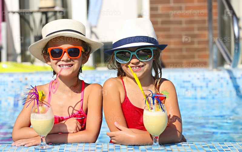 Две счастливые маленькие девочки в солнечных очках с коктейлями в шляпах