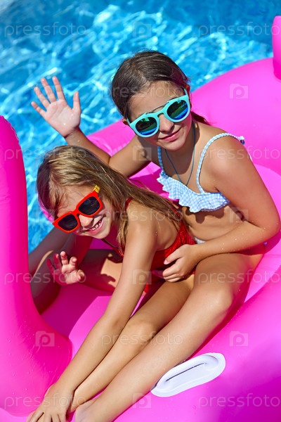 Портрет двух девушек в солнечных очках, счастливых друзей на надувном плавательном поплавке с фламинго