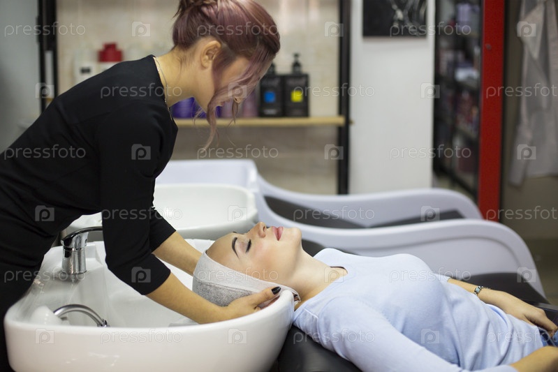 Великолепная молодая женщина улыбается, пока профессиональный парикмахер заворачивает мокрые волосы в полотенце после мытья, готовясь к стрижке в салоне красоты
