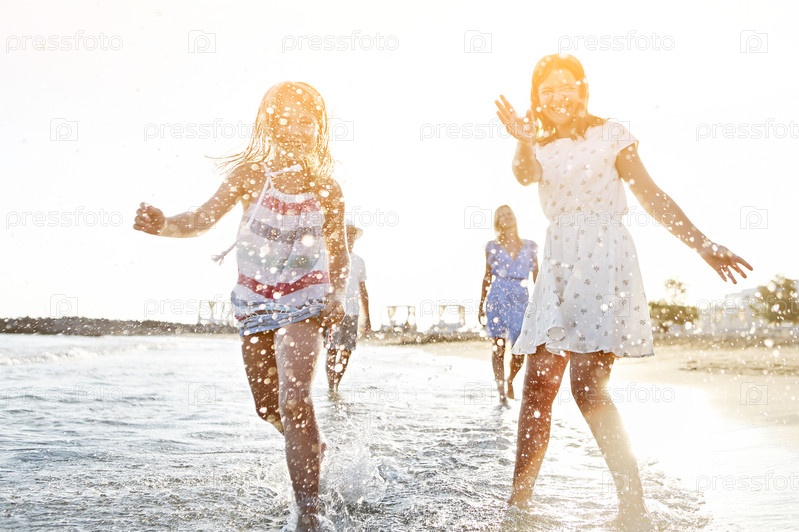 Счастливая семья бежит по морской воде