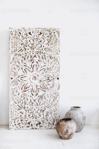Набор декоративных панно в этническом стиле и глиняные горшки, расположенные рядом с белой стеной в светлой комнате