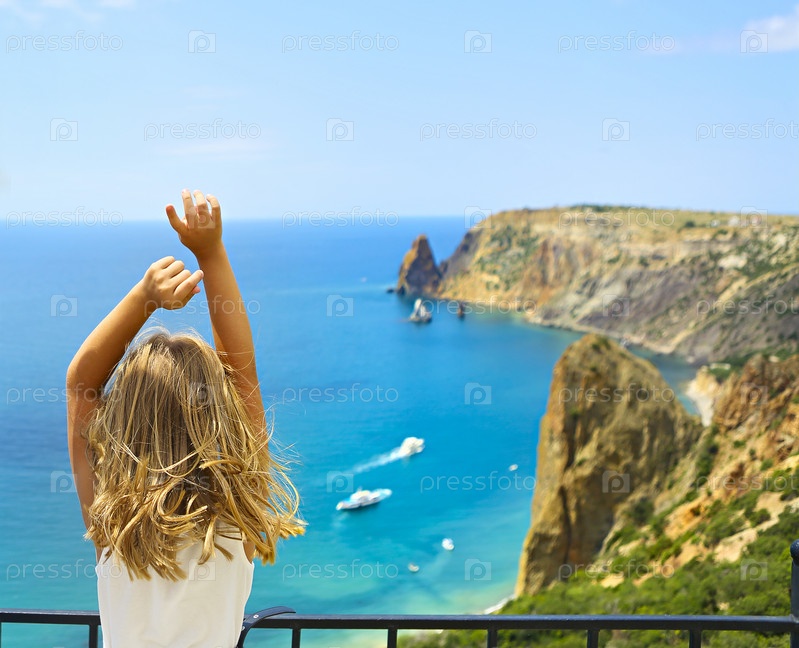Вид сзади на неузнаваемую девушку, стоящую с поднятыми руками рядом с забором на смотровой площадке и любующуюся живописным видом на скалистое морское побережье в солнечный день с ясным небом и голубой водой