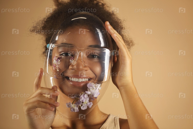 Веселая африканская американка в полном защитном прозрачном щите, украшенном цветами
