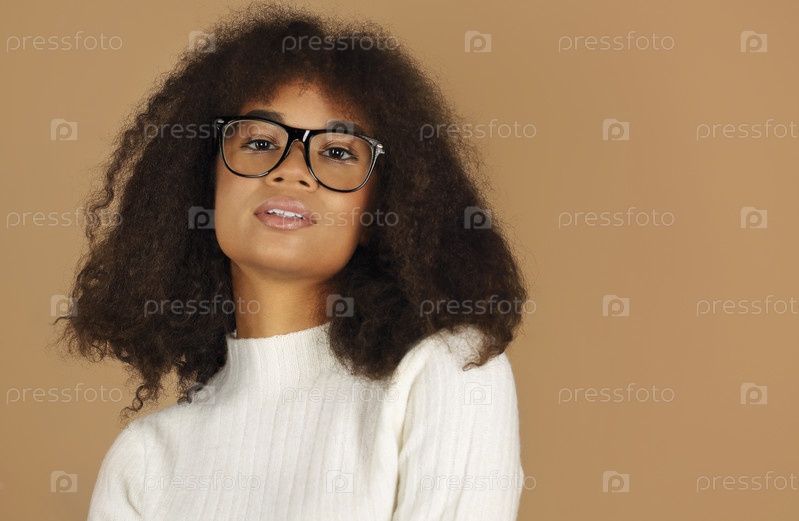 Молодая уверенная в себе африканская американка в очках с вьющимися волосами смотрит в камеру