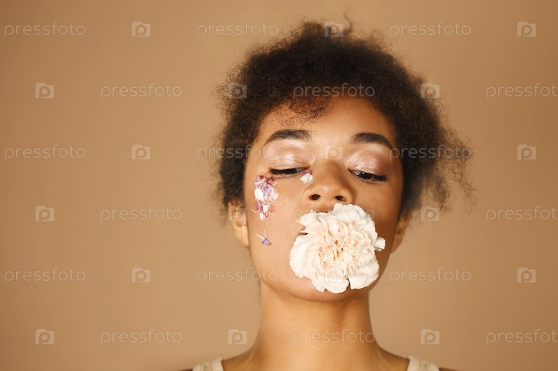 Привлекательная молодая афроамериканка с креативным макияжем позирует с цветком гвоздики во рту