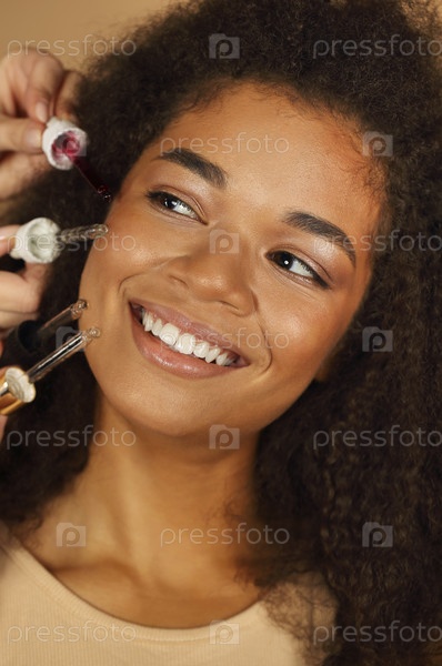 Молодая афроамериканка позирует с различными пипетками с различными сыворотками возле лица