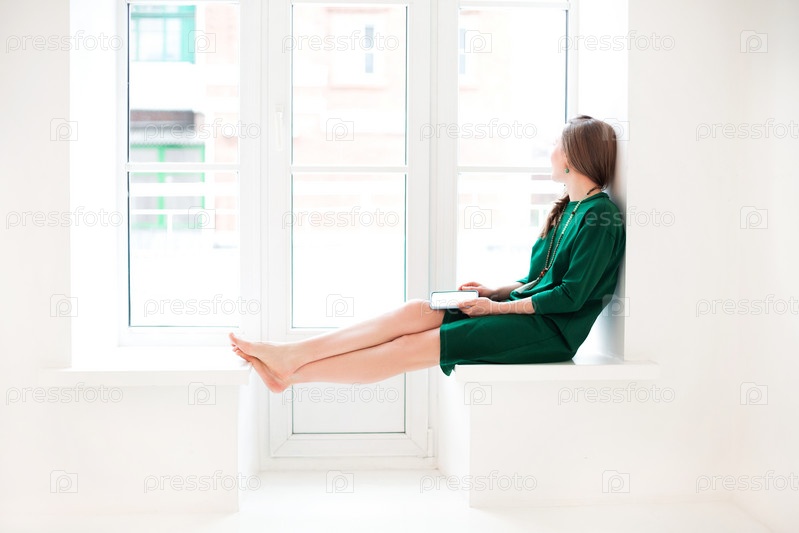 Веселая счастливая женщина средних лет в зеленом платье, глядя в окно с мобильным телефоном