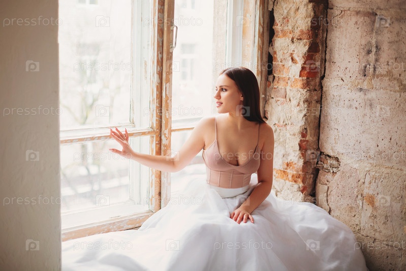 Красивая молодая брюнетка романтичная женщина сидит босиком в пушистой длинной белой юбке у бетонной стены в винтажном стиле