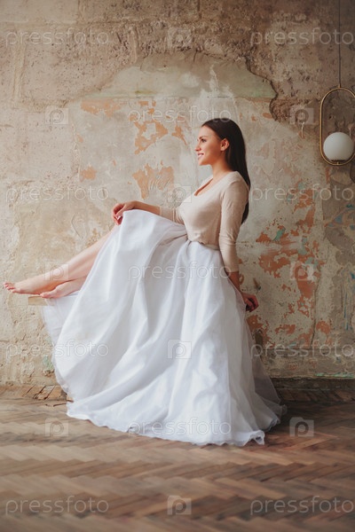 Красивая молодая брюнетка романтичная женщина сидит босиком в пушистой длинной белой юбке у бетонной стены в винтажном стиле