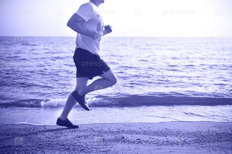 Мужчина бежит по пляжу на закате