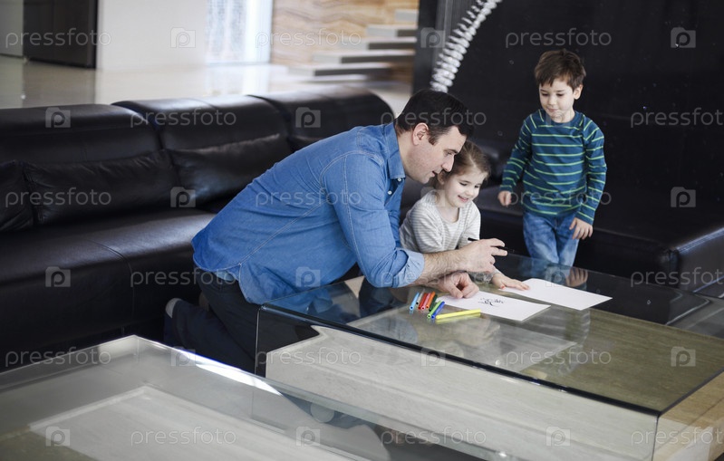 Молодой человек рисует вместе с маленькими дочерьми в гостиной