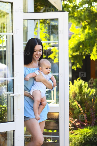 Молодая красивая мать обнимает своего маленького сына на улице. Мама и малыш веселятся вместе в зеленом саду