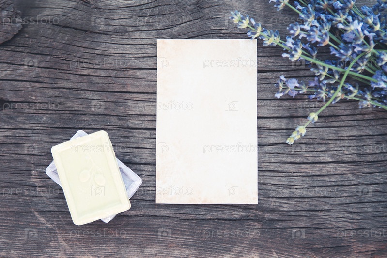 Лист бумаги в составе с букетом свежей лаванды на старом деревянном столе
