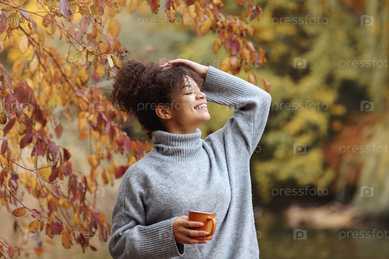 Молодая счастливая улыбающаяся женщина смешанной расы с чашкой кофе на осенней природе, довольная афроамериканка с вьющимися волосами в вязаном свитере