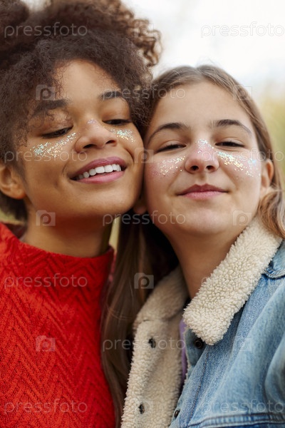 Портрет двух счастливых многорасовых подруг, улыбающихся в камеру, проводящих время на осенней природе, веселых девочек-подростков разных рас