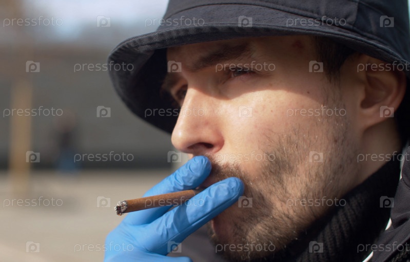 Большой план портрет молодого человека, курящего сигарету в защитных перчатках на открытом воздухе.Эпидемия коронавируса.Концепция здоровья и безопасности жизни.Пандемия COVID-19