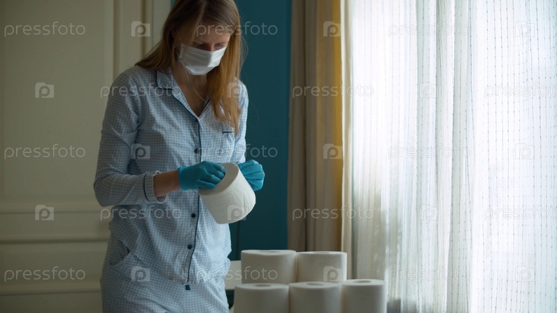 Панические покупки из-за коронавируса. Молодая женщина изучает запасы туалетной бумаги