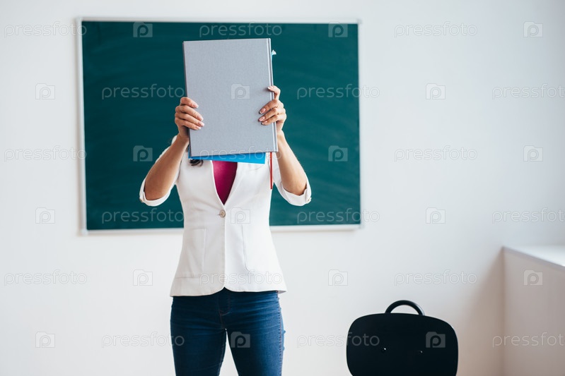 Студентка стоит возле доски с книгой