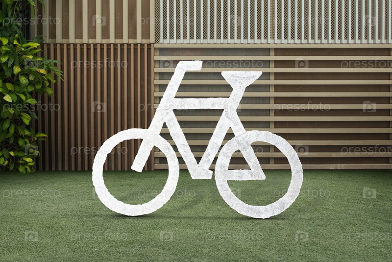 Знак велосипеда, езда на велосипеде на фоне деревянной стены травы