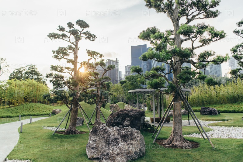 Ландшафтный сад, зеленая лужайка. Красиво оформленный сад