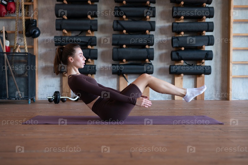 Молодая женщина делает тренировочные пресс-в-апы в спортзале