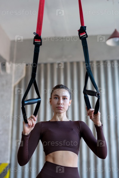 Подходящая женщина, стоящая в спортзале с trx
