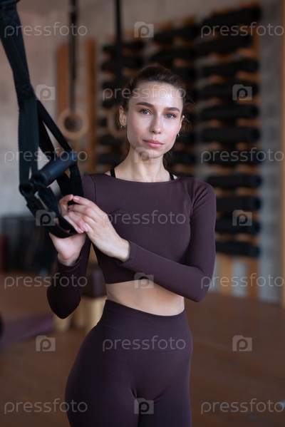 Подходящая женщина, стоящая в спортзале с trx